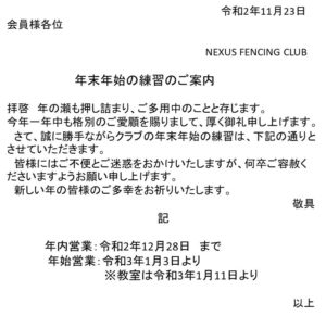 2020年度年末年始の練習のご案内